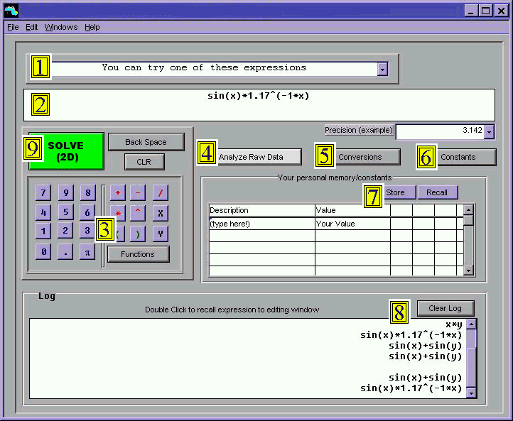 | 8 | Log Window | Every expression that you enter into the expression box will be entered into this permanent log for you convenience. The length of this log depends on how much memory your computer has. It will save thousands of entries. |