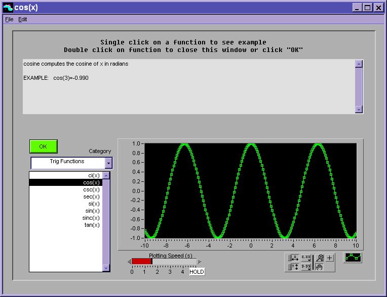 The Purpose of this screen is to allow to pick a math function to insert into your calculator expression. As you click on each function, the graph will update real time so you will see what the function looks like on the plot. This can be very helpful when you are not sure which function you are looking for and need to take a quick glance at it to make sure it is the one you want. It has special plot tools for you to zoom in/out.
